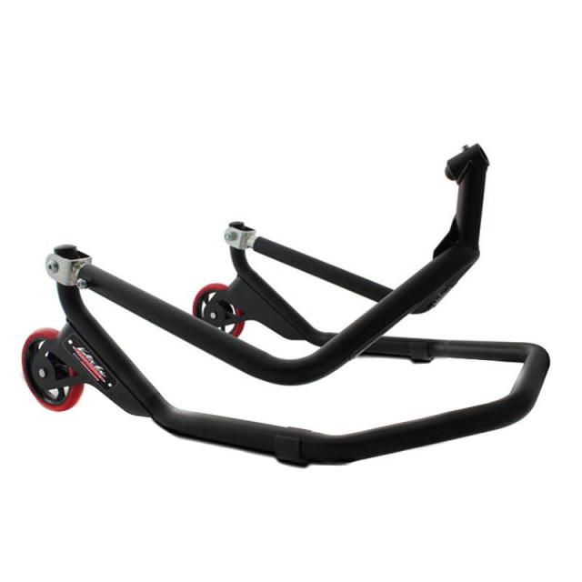Conçu pour lever la roue arrière par les diabolos La largeur peut être ajustée manuellement pour s'adapter a toute les moto de coursesFabriqué en acier robustePeint avec un revêtement en poudre spécial en relief longue duréeÉquipé de deux grandes roues rouge et noirCouleur noir