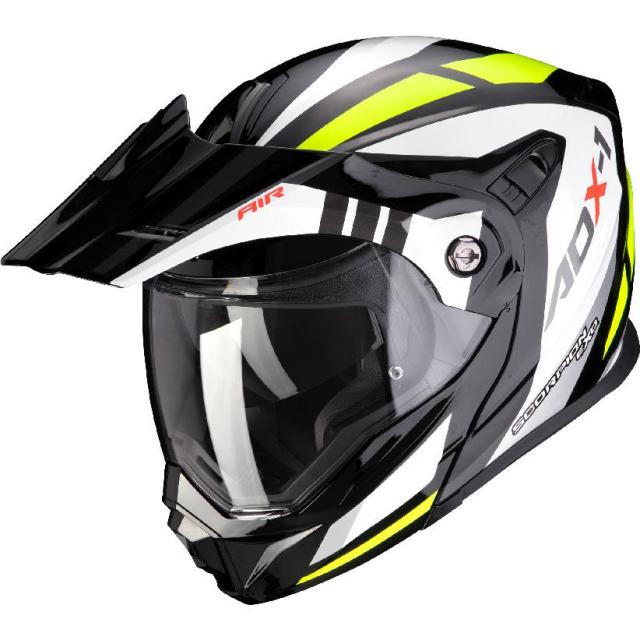 Casque adventure adulte, homologué ECE 22-06, polyvalent (trail, routier, modulable), coque polycarbonate, 2 tailles de calotte, intérieur KwikWick C, écran incolore anti-rayures avec Pinlock Max Vision, écran solaire Speedview antibuée, casquette détachable, ventilation, prédisposé Bluetooth Scorpion Exo-Com (option), housse incluse.