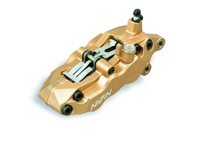 Etrier de frein 4 pistons radial avant droit Or Nissin N4RC108GR - Piston ø 34/30 - Position: droit - Couleur : or - Entraxe : 108 - Plaquettes compatibles 2P287 - Livré avec plaquettes 2P287ST - Pour disques ø 250 à 330 mm et épaisseur 4.5 à 5mm