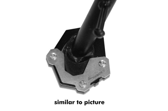 Extension de béquille Touratech - Argent: Caractéristiques: Extension de la plaque de béquille latérale Touratech ? Argent Conçue pour les BMW R1200GS (2008-2012) et R1200GS Adventure (2008-2013), cette extension agrandit la surface d'appui de la béquille latérale pour limiter l'enfoncement sur sols meubles. Idéale pour les bivouacs improvi …