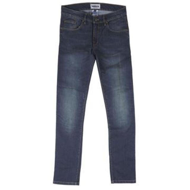 Jeans homme en coton et Armalith. Effet usé à la coupe ajustée. Inserts en Lycra. Protections genoux et hanches CE BETAC amovibles et réglables en hauteur. Certifié CE