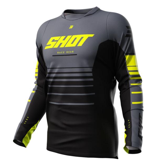 Maillot cross Shot DEVO - STAR 2023: Matière: En Polyester Micro-Mesh pour un flux d'air optimisé Empiècements Lycra au col pour un confort accruLes "+": Col en Lycra pour plus de confort Manches à coupe Raglan Dos allongé afin de maintenir le maillot en place dans le pantalon Coupe anatomique pour une souplesse maximum Couleurs inaltérables
